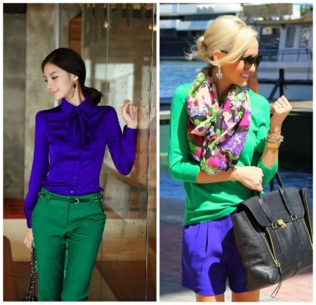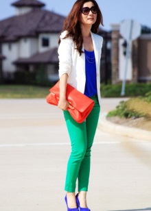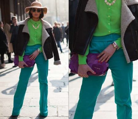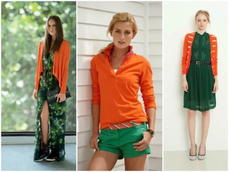 - Green and orange. Bright, saturated summer colors harmoniously complement each other. It looks very stylish, for example, a green suit and accessories in a rich orange color or vice versa.
