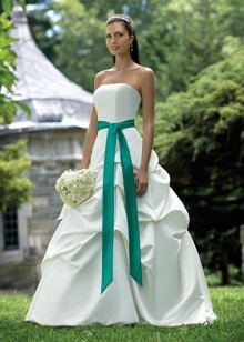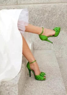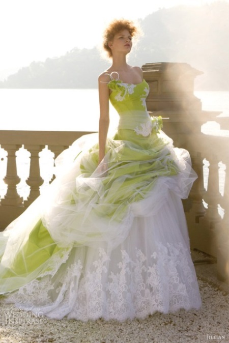 Green color is one of the most beloved for use in wedding attire. And even if the bride does not dare to try on a green dress, she is happy to use green elements in her outfit. It can be trim elements, jewelry, buttonhole, diadem, slippers or handbag.