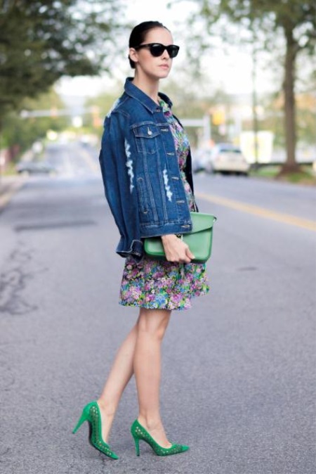 Original design green high-heeled shoes perfectly complement the set of colorful dresses and denim jackets. The image is perfectly complemented by a small green handbag.
