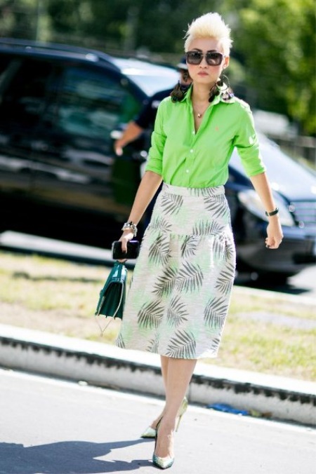 An excellent summer set for a business lady: a light skirt on a yoke, decorated with an interesting print, a delicate green shirt and elegant high-heeled shoes. The image is harmoniously complemented by a neat emerald-colored handbag.