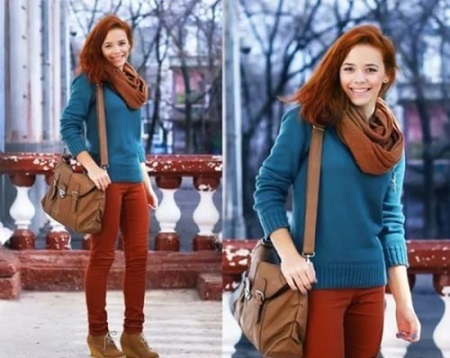 The base of the wardrobe are rich brown, brick, copper shades, as well as the color of cinnamon. It is this palette that most successfully sets off the skin. In second place will be shades of green, khaki, kerosene, mouse shades of brown and green.