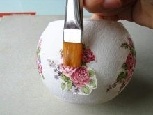 - Decoupage cards, photographs, and other drawings on a paper basis are pre-cut and soaked for 20-30 seconds, then carefully spread with their face on a clean layer of paper or cellophane, spread with a damp brush and carefully rolled up excess layers of paper, dried a little.