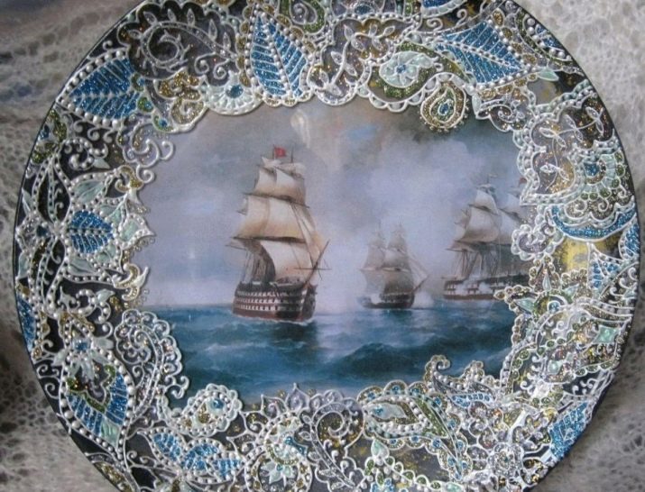 - Marine theme selected in the work on the plate. The decoupage technique is complemented by painted elements using rhinestones.