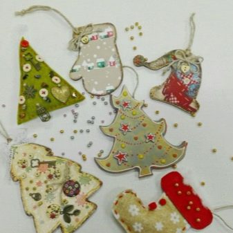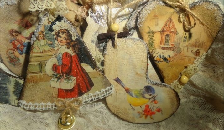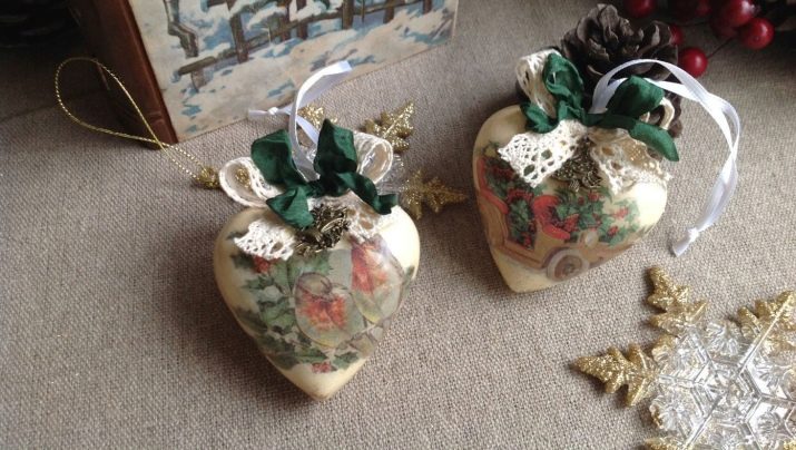 In addition to Christmas balls, decoupage is very popular. heart toys. As an additional decoration, use bows made of ribbons and lace lace.
