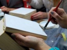 The decoration of the second lid is started after the first is completely dry. They also process the spine of the book.
