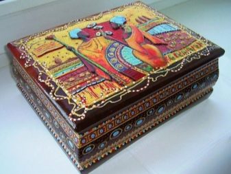 When everything dries, a transparent varnish in 2-3 thin layers is applied to the box. Inside it can be painted in any color, pasted over with patterned paper, fabric, velvet. That's all. The work is done. It remains if you want to glue the metal corners and add a little gilding.