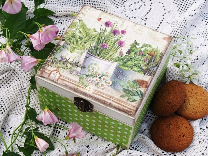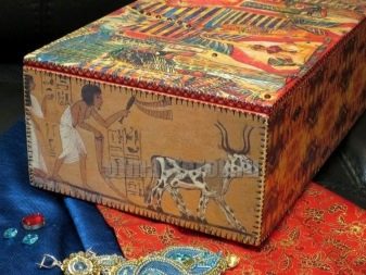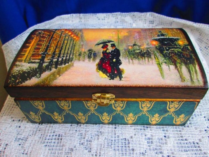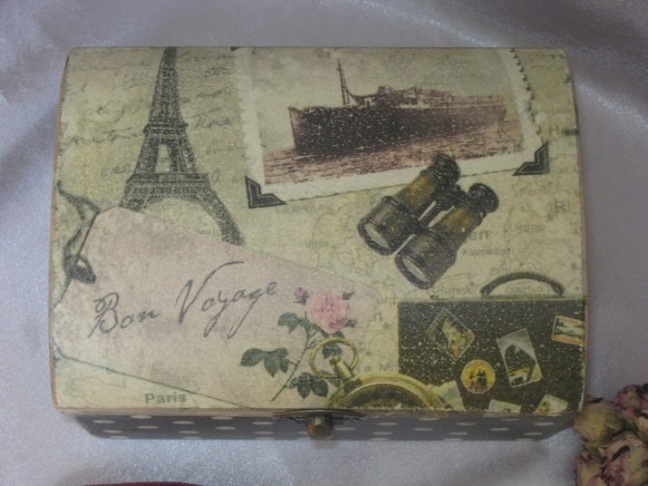 - The next moment is transferring pre-prepared images to the box. Its implementation will require attention and accuracy. For this purpose, decoupage napkins are used, instructions are sold in stores complete with them, which details how to separate a drawing from paper.