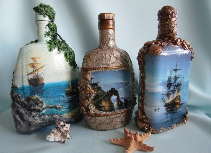 Some lovers of sea holidays get beautiful glass jars, pour sand from their favorite beach, shells, pebbles there, and the jar itself is decorated with napkins in a marine theme.