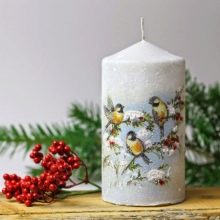 This technique is good for beginners and allows you to get acquainted with the basics of decoupage. If you can’t find thick candles for work, you can use those with relatively loose walls. To transform them you will need napkins for decoupage, sharp nail scissors and a stick with a smooth surface.