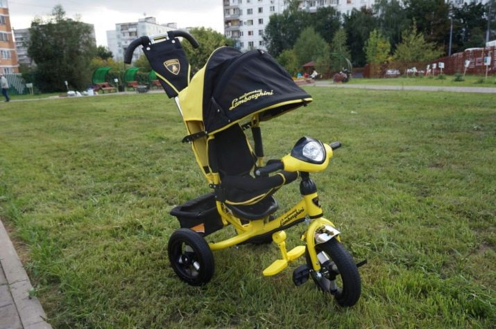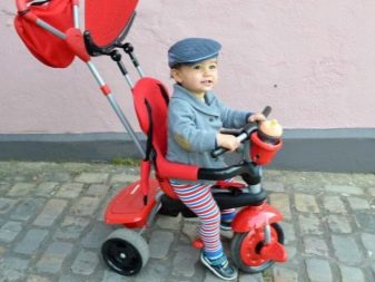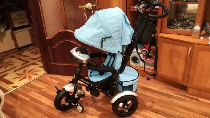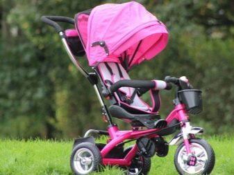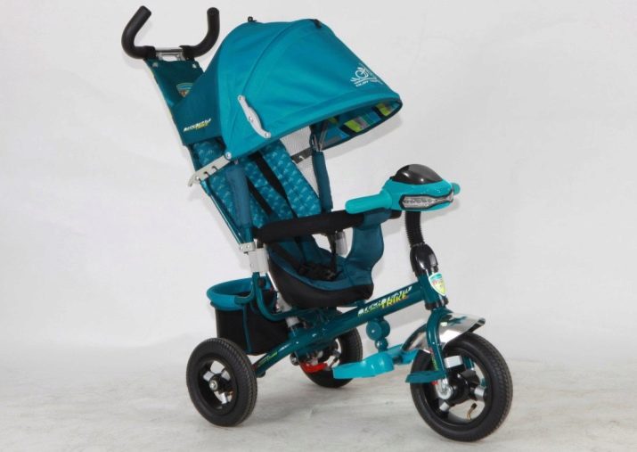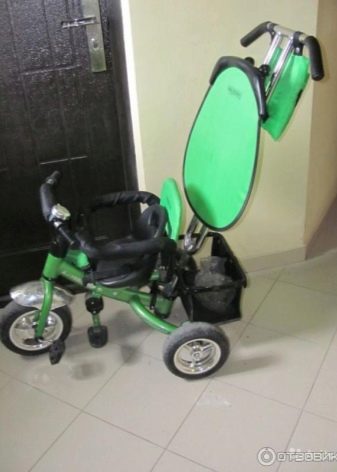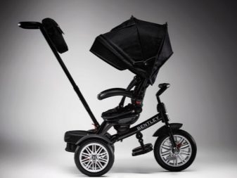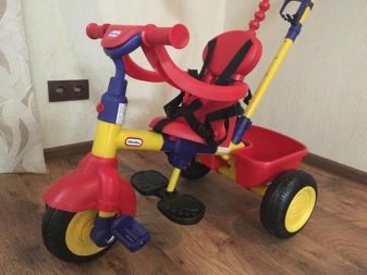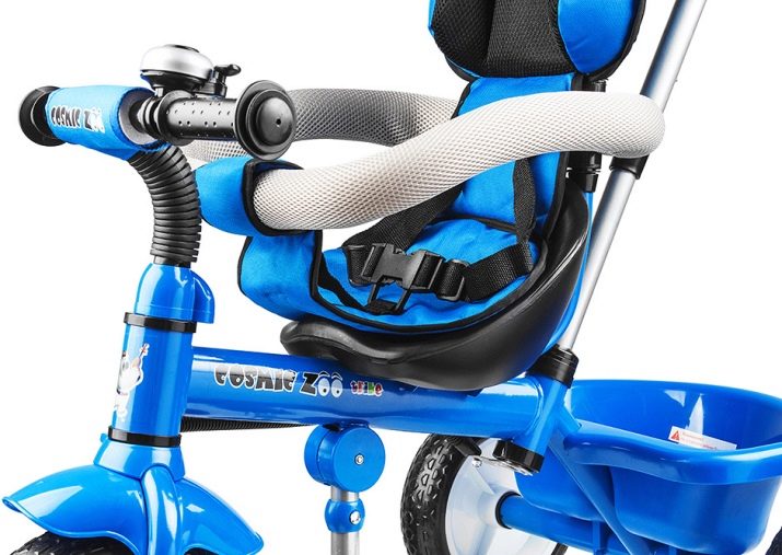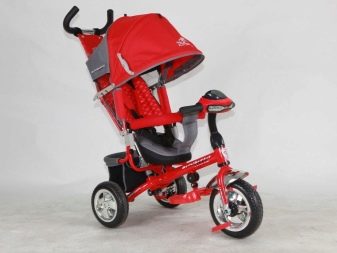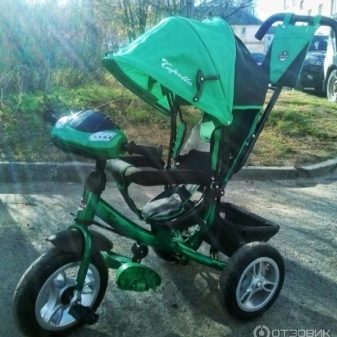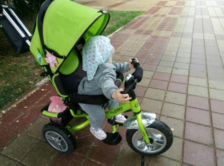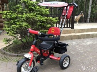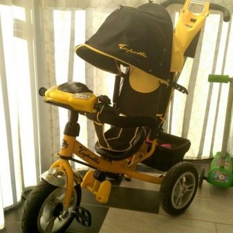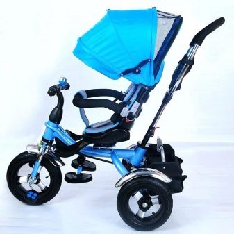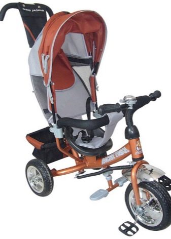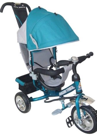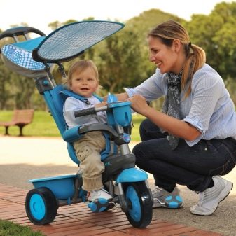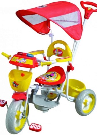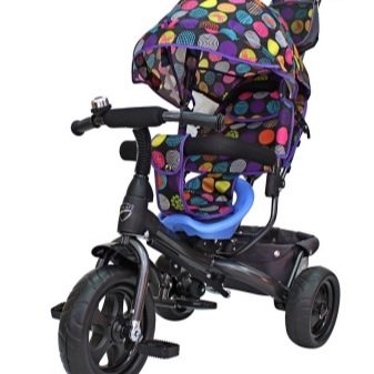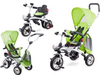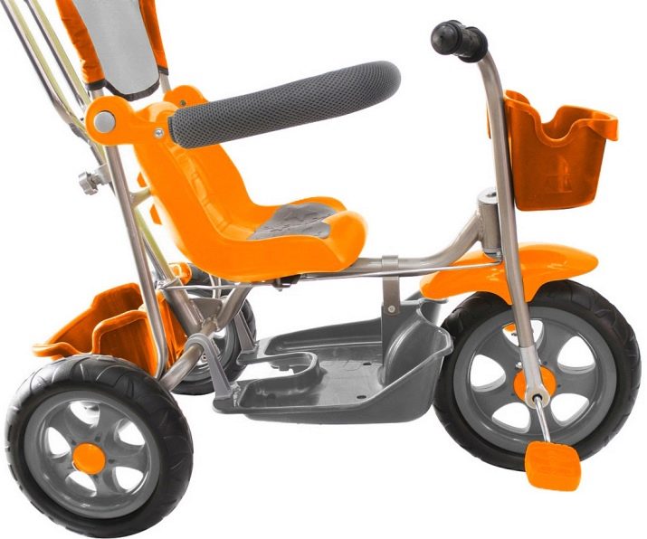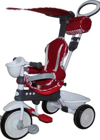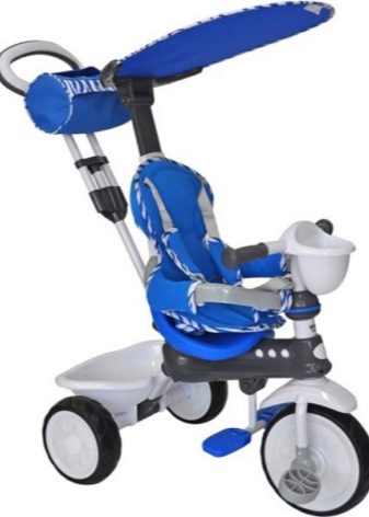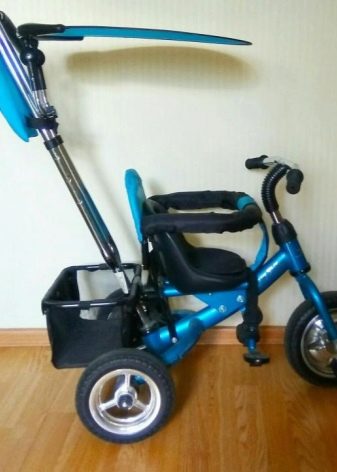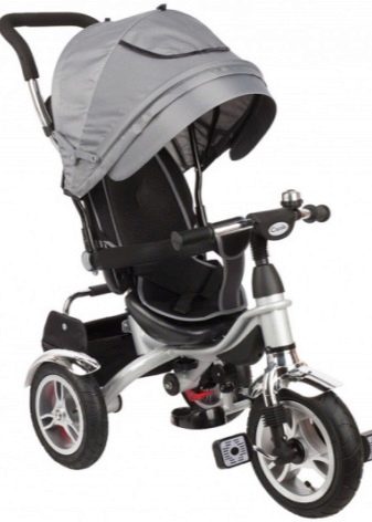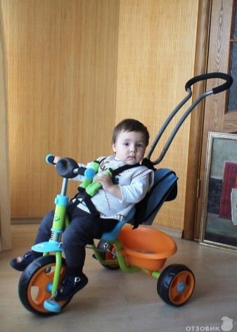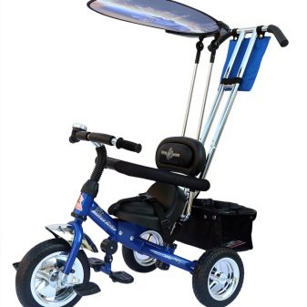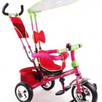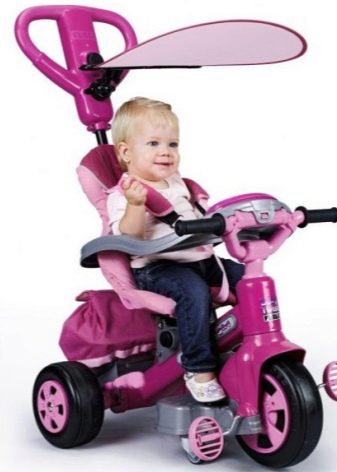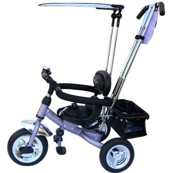 - The very first models are designed for babies from a year old, they belong to the group of wheelchairs, that is, no longer wheelchairs, but also not full-fledged bicycles. Appearance meets the parameters of a three-wheeled "bike", but the baby only sits in it, and one of the parents performs the role of the "driver". The features of this product are enhanced comfort. There is a comfortable chair with a back that can be adjusted, a seat belt, a bumper, a hood that protects from the sun, a basket for storing toys and things for walking; additional entertaining elements.