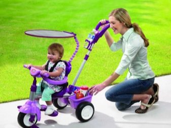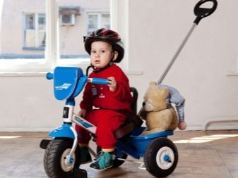 A bike with a handle can be purchased for a child from 1 year old. He replaces the stroller and accustoms the baby to independence. Walking on it is less comfortable, but fun, exciting and developing. Many designs have the ability to adjust the location of the pedals and seats, this allows parents to adjust the transport for the growing child.