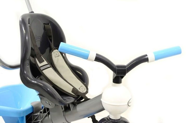 Child safety is ensured by safety belts and a protective rim with a soft pad. The kit includes a basket for things and toys. The bike is presented in blue and red.