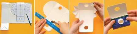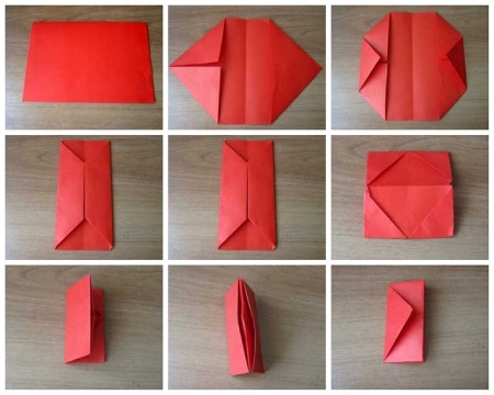 The next step: fold the sheet in half and cut a small hemisphere in the middle. Then paste the back side of the sheet with tape, and bend the sheet itself in three places along the previously drawn lines. Now it remains to arrange the resulting purse-wallet with applique, lace, lacing, ribbons to your liking and a stylish accessory is ready!