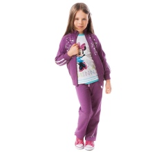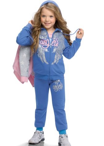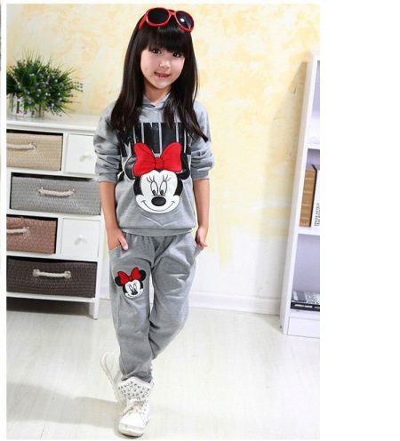 - A stylish tracksuit made of dense gray fabric containing cotton and knitwear fibers, decorated with a cute print with the image of baby Minnie Mouse. White leather sneakers with an elongated tongue adorned with silver large stones will be a great addition to the look.