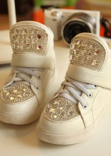 - Among children, dark colors are not so popular. Although they are very practical, but, nevertheless, do not please the children's eye. Most often, black sneakers become a favorite choice of girls in their teens, especially if the model has a decor in the form of rhinestones or precious stones.