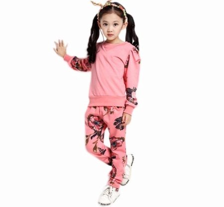 - A tracksuit consisting of a pink sweatshirt with a plain front and printed sleeves and pants with the same floral print will look great and very stylish with white leather sneakers with a rounded toe.
