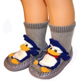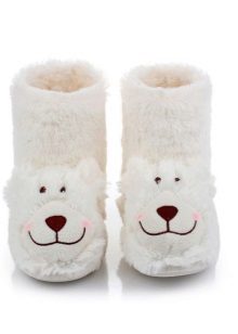 Among the unusual and original models, slippers-socks can be noted. Knitted, soft slippers tightly fit the child’s leg, like a warm grandmother’s sock. In such slippers, the leg will not freeze, and it’s convenient to walk. Depending on the season, such slippers can be summer or winter. The first are knitted from light yarn and have an openwork pattern. Warm slippers are knitted from natural wool, sometimes complemented by fur.