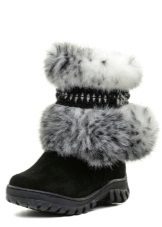 The classic model of high boots for girls 10-12 years old. The top is trimmed with combined fur: the top is a fluffy fox, while the bottom is shorter. The color scale of high fur boots is built on contrast - red-brown fur and black leather bottom (decorative straps have the same color and texture). A thick felt sole is guaranteed to prevent your feet from freezing. Note that girls wear such voluminous high boots, usually with trousers, tucking them inside the shoe.