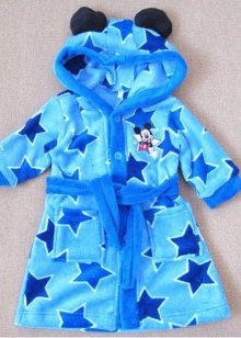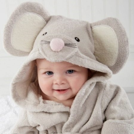 - Kids look especially charming in cozy terry, fleece or flannelette dressing gowns with the image of funny animals. For example, like this cute baby in a warm robe with an image of a funny mouse.