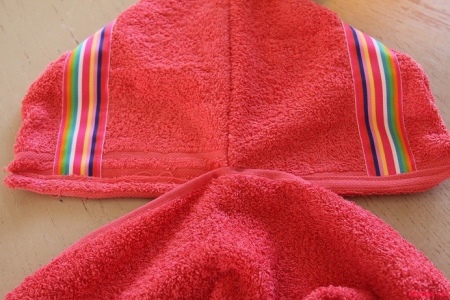 One of the easiest options is a bathrobe made from a bath towel. To do this, fold the towel four times and lay out a baby T-shirt or dress on the fabric so that the central part of the neck coincides with the central corner of the towel.