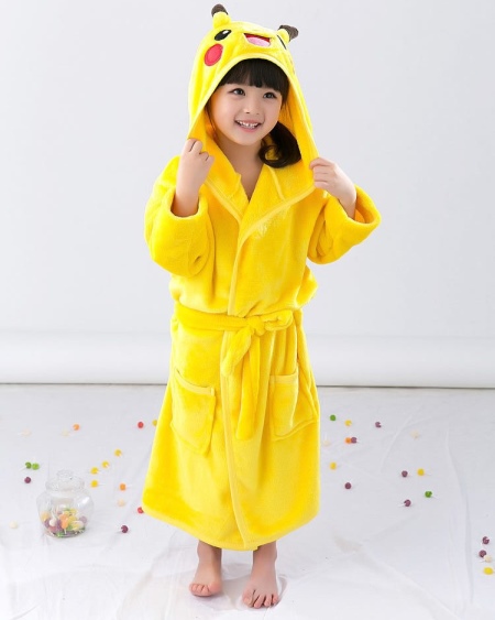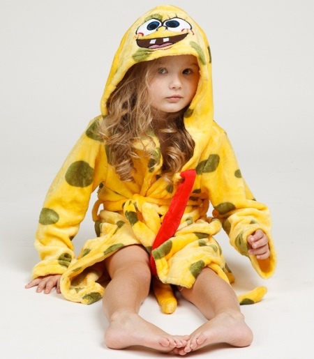- Lovers of popular cartoon characters will surely like a beautiful bright yellow bathrobe with a belt and a hood depicting a beloved hero.