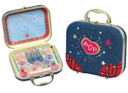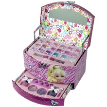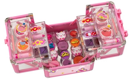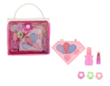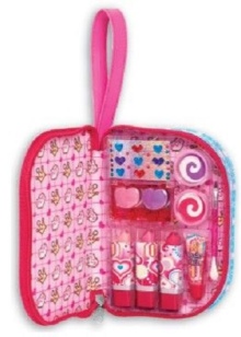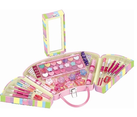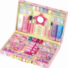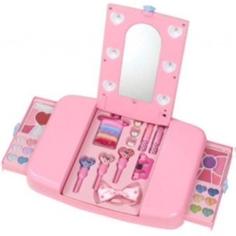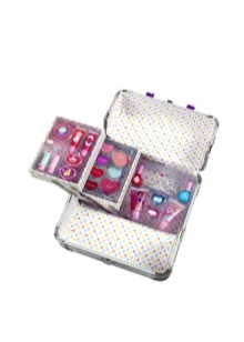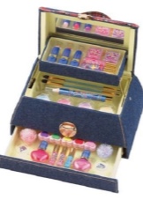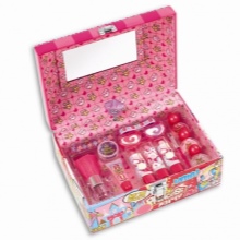- Many brands today offer ready-made sets of children's cosmetics for girls of any age. The standard set usually includes fruit gloss or lip balm, a bottle of toilet water, scented soap, nail polish, and shade. More voluminous sets include several palette of eyeshadow with sparkles, various lip glosses, lipsticks, brushes for eyes and lips, pencils, sponges and other objects.