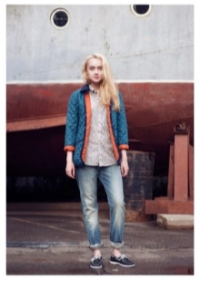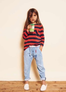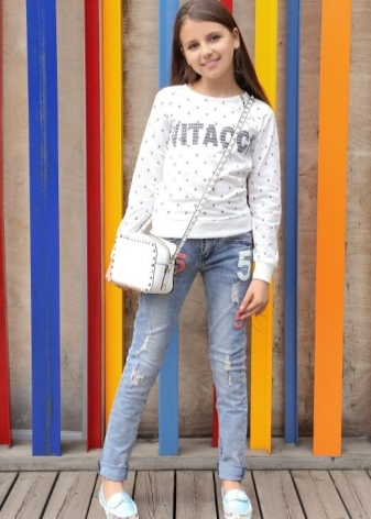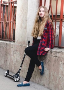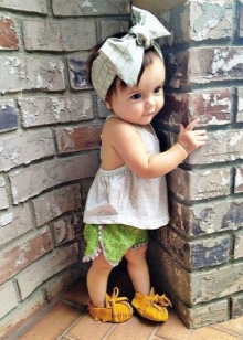 Preschool girls can combine versatile moccasins with classic jeans, knitted pants, light shorts and skirts. Upstairs you can wear a regular T-shirt or t-shirt if it comes to the summer season. For a cool spring or autumn, it is better to choose jeans, a warm sweater or turtleneck.