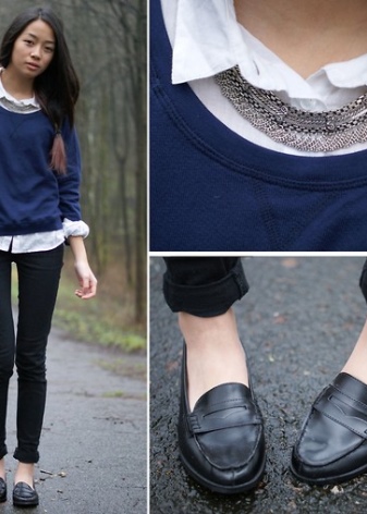 Universal moccasins will harmoniously look not only with everyday clothes, but also in a strict school uniform. For any dress code, you can easily choose the right model. For classes, it is better to choose solid models from matte and patent leather without unnecessary decor details and shiny stones.
