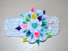 One of the popular styles of this type of dressing is a product made in the kanzashi technique of multi-colored satin ribbons. The technique is a composition of small fragments.Each blank consists of a square of satin ribbon folded in a certain way. There are many ways to fold parts, this gives a lot of opportunities for design.