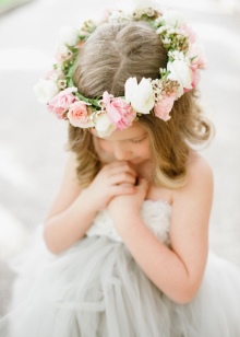 At the exit, you can wear a wreath bandage, generously decorated with flowers from textile or foamiran. Such an ornament will look perfect with a ballroom and airy elegant dress, especially if the shades of the floral arrangement are repeated with the decorative elements of the dress. Delicate sandals perfectly complement the charming set.
