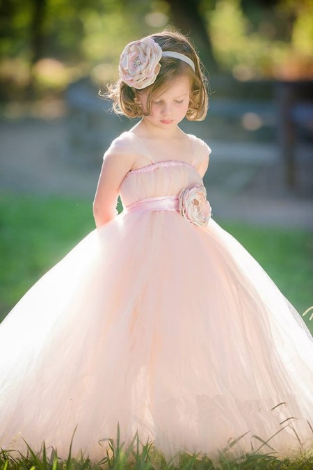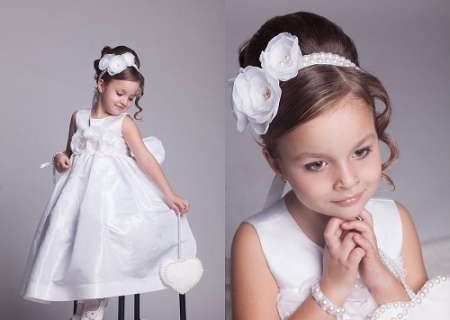A really thin white bandage with a multilayer flower looks really fabulous, complementing a light sleeveless dress with a full skirt. A fashionable handbag and white shoes - and the image of the little princess is ready!