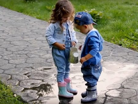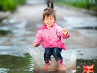 All girls love pink. And cloudy or rainy weather is a great occasion to try on bright pink rubber boots complete with your favorite jeans and a pink jacket. Bright and sunny outfit for a walk on the street.