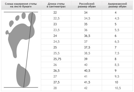 Using a dimensional grid, after selecting the required size in the table, you should choose shoes with a margin of 0.5 cm - 1 cm. Accounting for the foot allows you to choose shoes with a wide leg, even with a warm toe.
