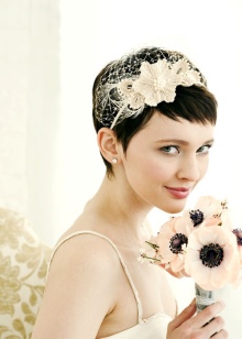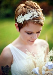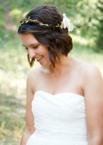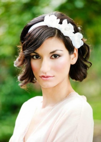 For girls with a square or a bob haircut, a Greek hairstyle would be a good option if it fits into the overall wedding look. Equally interesting on short hair looks styling in retro style with neat curls and a simple, thin rim.