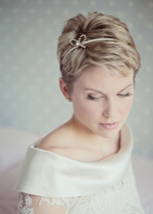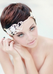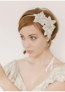 Girls with short hair, if they do not plan to use a chignon or hair extensions, do not have to choose a hairstyle. In this case, a wide and massive rim with an abundance of decorative elements will replace the chic festive styling.