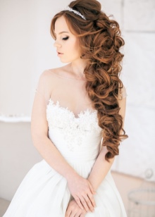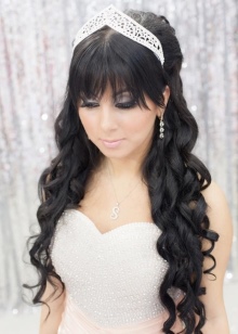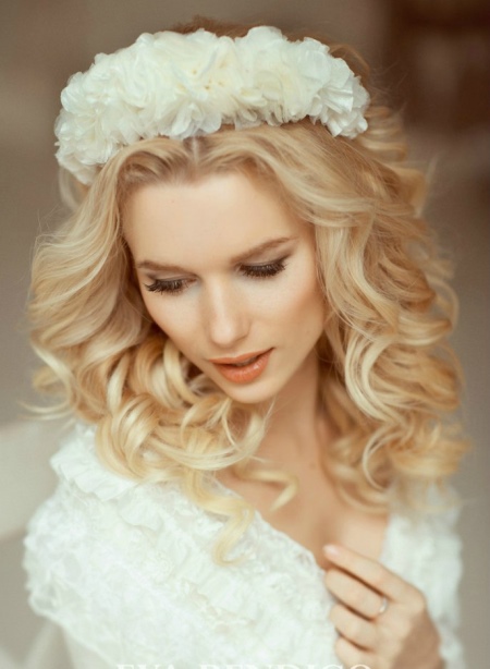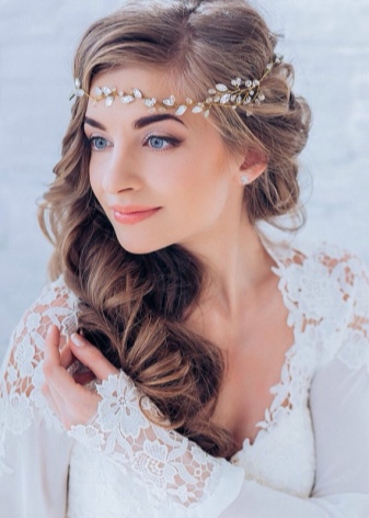Lush curls or a high pile and perfectly straight hair - each bride chooses a hairstyle according to her dress style and her preference. For such a simple styling, the best addition will be the original and beautiful bezel, made in the style of a wedding dress.