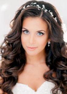 For gathered in a ponytail or bow, as well as loose curls, beautiful headbands with flowers or stones will do, which will accent and complete the image with a white dress.