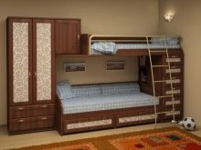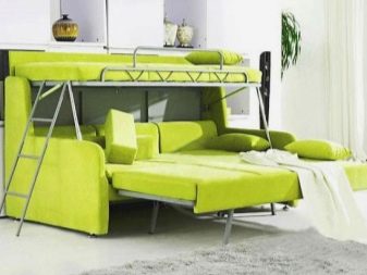 For small houses and apartments in which a family lives with children, the best option to equip several beds at once is considered to be a bunk bed, where the lower "floor" is represented by a small folding sofa, and the second - an ordinary bed. Such furniture allows you to solve several problems at once: