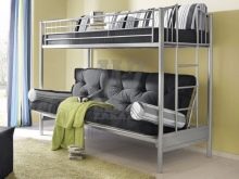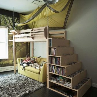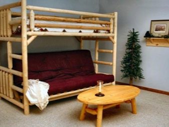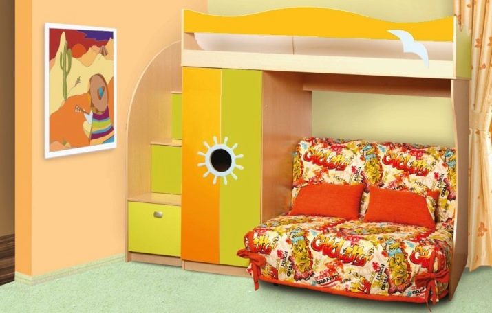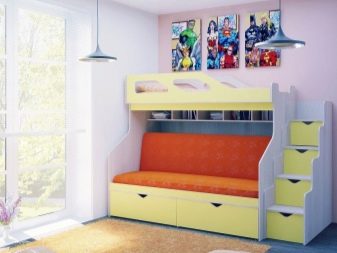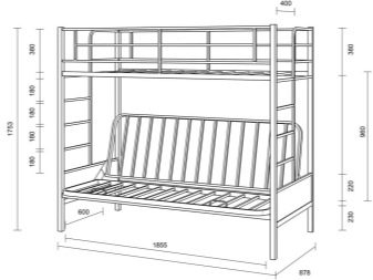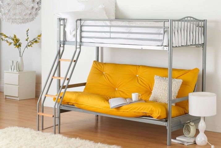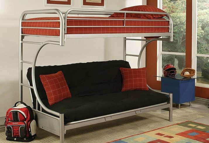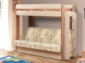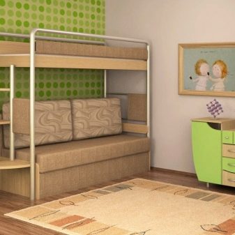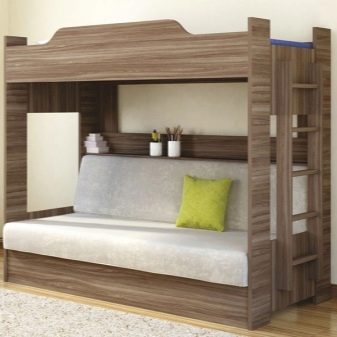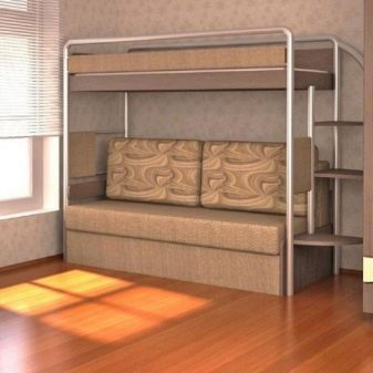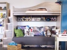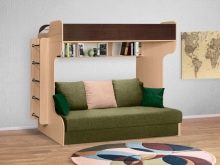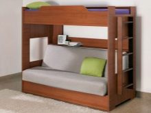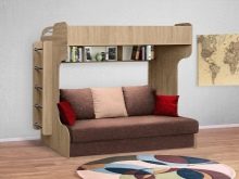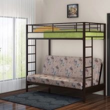 - Two-level model with a sofa bed. In this case, a bed is placed at the top, and a stationary sofa is located below. Such products create two functional zones - a resting place and a platform for daytime spending time (talking with friends, reading, playing games, etc.).
