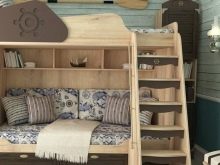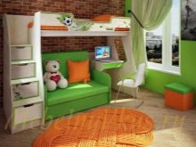 The bed for boys is decorated in brown, blue, olive and light gray colors, the upper floor is usually decorated, giving the resemblance to a typewriter or a ship. The use of black colors is allowed only in the room of teenagers, while the color must be complemented by printscorresponding to the stylistic decision of the interior of the teenager.