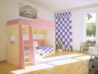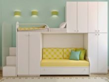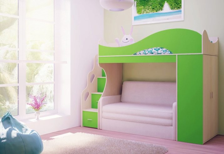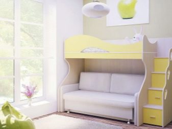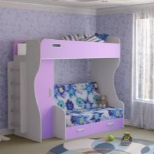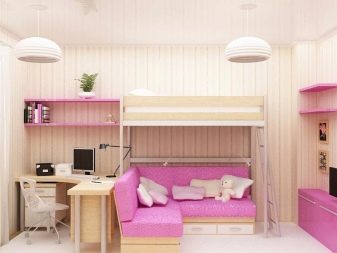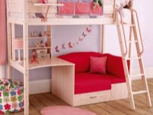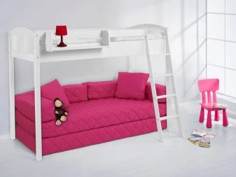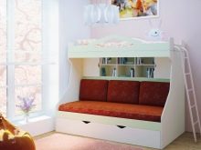 A bunk bed with a sofa for girls is usually decorated in light, delicate shades - white, pink, pale purple, blue. The second floor is often made in the form of a fabulous house or carriage - thus the sleeping place can be used not only for relaxation, but also for games. For teenage girls, the emphasis is on the sofa - the upper unit looks like a standard bed, and the lower one is more stylized, taking into account the interests of the owner of the room.