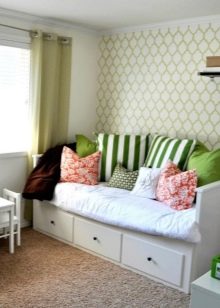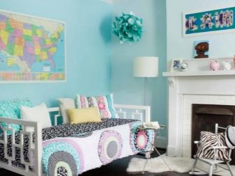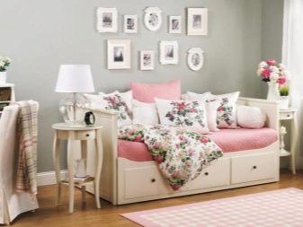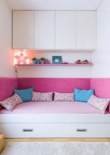 In the girls' room, it is better to give preference to a delicate color palette - pink, nude, light purple. It is possible to place cushions, for example, in the shape of a heart.