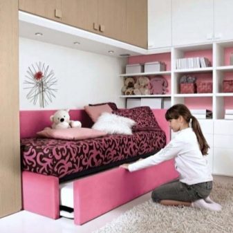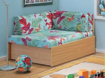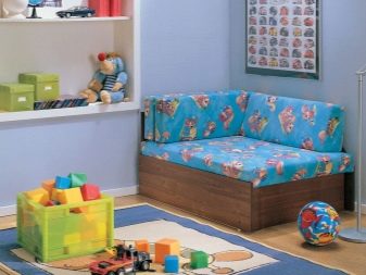 Sofa sofa is considered an ergonomic solution for a small children's room. In the folded state, the furniture significantly increases the free space for games and communication with friends, and when unfolded it creates the necessary conditions for a comfortable sleep. As a rule, in the lower part of the sofa there are boxes and blocks for storing bedding and sleeping clothes.