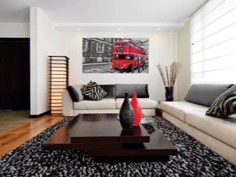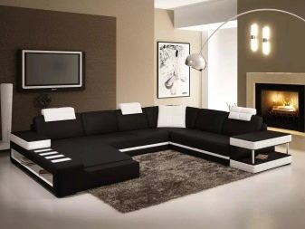 The optimal colors of upholstered furniture are white or black. It all depends on the scale of the living room itself. The shape of such a sofa should be as simple as possible, concise, lines - strict and clear. If the whole environment is designed in a conservatively restrained style, you can upholstery a sofa with leather or choose a model with an unusual design.