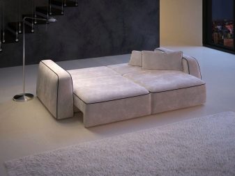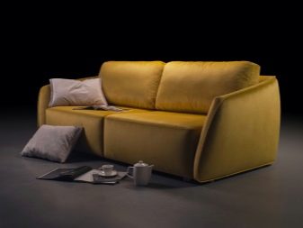 This design is available with several types of folding mechanisms, the upholstery can be made from fabric, and from suede or leather. The manufacturer complements the sofas with polyurethane foam mattresses, which have high elasticity. The frame of the structure is made of metal, it has the appearance of a grid and is combined with wooden slats.
