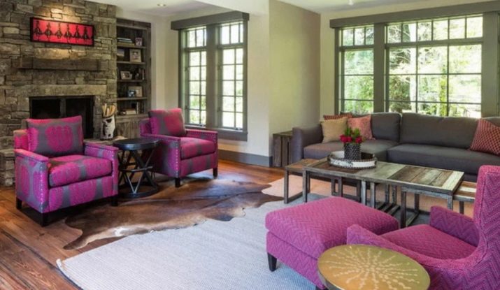 Some prefer an accent chair with a neutral sofa color. Others, on the contrary, opt for a color accent of the sofa and neutral chairs. Striped or checkered upholstery of chairs is perfectly combined with a plain sofa, on which striped poufs, a cell can be located. The highlight is the different style of multi-colored objects of the soft corner.