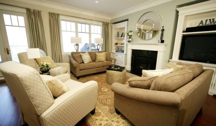 Placement of upholstered furniture should be functional. It is advisable to leave the distance between objects at least half a meter for free movement of family members and guests. The height of the tables and armrests should be the same. Soft headsets are usually not placed along one wall; A good option is to sit in front of the couch. To avoid internal discomfort, the front door should be visible to everyone sitting.