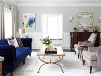 There are a lot of design options with a blue sofa, in addition, you can come up with it yourself. But we will look at three main types of living room or hall design.