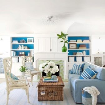 - White. The most common combination is white with blue. If you are afraid that the combination of these tones in the design of the living room will be too cold, you can dilute the interior with bright details.