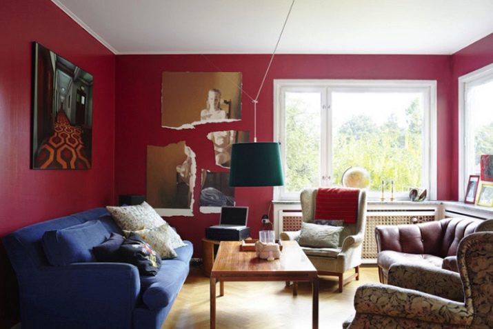 - Red. The combination of red and blue tones is a bold decision. Therefore, you need to carefully approach the choice of parts in red. It is better that they be dark red shades: wine, cherry, burgundy.